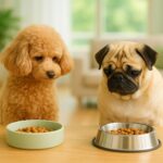 トイプードルのイヴとパグのしずくが、それぞれのフードボウルを穏やかに見つめている。