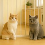 スコティッシュフォールドの詩とブリティッシュショートヘアの姫が、キッチン前のゲート越しに並んでいる。自然光が差し込む明るい木目フロア。